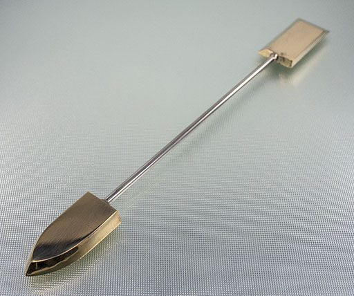 Double ended glass shaper. One end has a rectangular shape with two straight blade edges with two different angles. The other end has a 'shield' shape with two curved blade edges, joining in a point. Each end is approximately 40mm long, 19mm wide and just under 5mm thick.